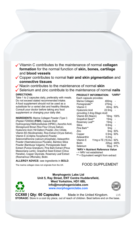 Marine Collagen Powder (Type I) (Peptan F2000ld) (FISH), Hydroxypropyl Methylcellulose (capsule shell), Ascorbic Acid, Hyaluronic Acid Powder, Zinc Citrate, Vitamin B3 (Nicotinamide), Rice Extract, Vitamin E (d-Alpha-Tocopherol) Powder, Selenomethionine, Astaxanthin Powder, Bamboo Silica Powder, Grapefruit Seed Extract, Pine Bark Extract, Copper Glycinate, Rosemary Leaf Extract, Biotin.
