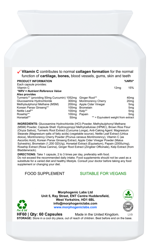 Glucosamine Hydrochloride (HCl) Powder, MSM Powder, Capsule Shell (HPMC – plant-based), Brown Rice Flour, Turmeric Root Extract, Magnesium Stearate (vegetable source), Nettle Leaf Extract, Montmorency Cherry Powder, Vitamin C (Ascorbic Acid), Korean Panax Ginseng Extract, Apple Cider Vinegar Powder, Bromelain, Horsetail Extract, Papain, Rosehip Extract, Ginger Root Extract, Kelp Extract.