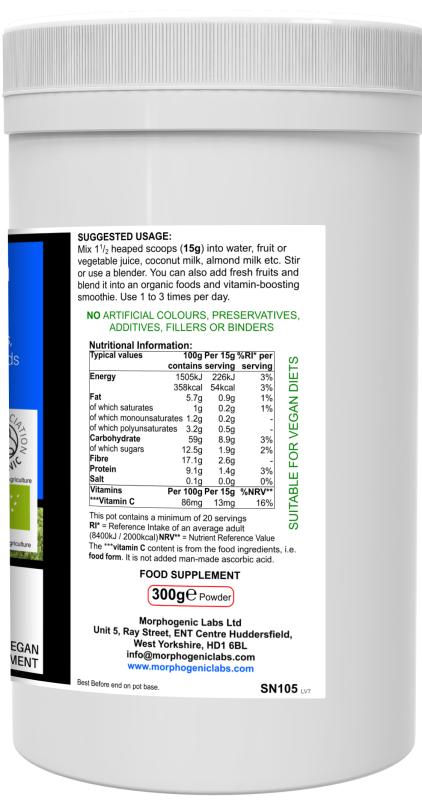 Pre-Sprouted Activated BARLEY, Lucuma Fruit, Linseed (Flaxseed), WHEAT GRASS, Quinoa, BARLEY Grass, Apple, Acai Berry, Baobab Fruit Pulp, Kelp (Ascophyllum Nodosum), Spirulina, Turmeric, Alfalfa, Carrot, Bilberry Fruit, Spinach Leaf, BARLEY Grass Juice, WHEAT GRASS Juice, Beet, Acerola Cherry Extract, Chlorella (Broken Cell Wall), Nettle, Tomato, Bilberry Extract, Blueberry, Cranberry, Green Cabbage, Kale, Parsley, Kale Sprout, Broccoli Sprout, Reishi Mushroom, Cordyceps Mushroom, Shiitake Mushroom, Cauliflower Sprout, Maitake Mushroom, Enzyme Blend* (protease*, amylase*, bromelain*, cellulase*, lactase*, papain*, lipase*).