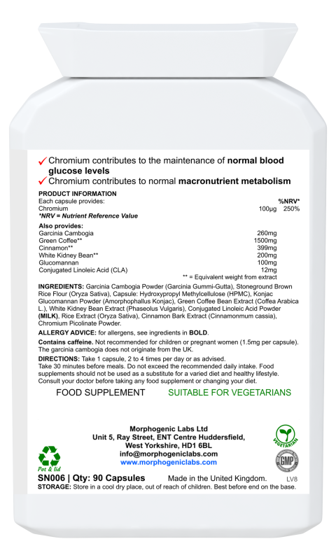 Other Ingredients: Garcinia Cambogia Powder (Garcinia Gummi-Gutta), Stoneground Brown Rice Flour (Oryza Sativa), Glucomannan Powder (Amorphophallus Konjac), Green Coffee Bean Extract (Coffea Robusta), White Kidney Bean Extract (Phaseolus Vulgaris), Conjugated Linoleic Acid (CLA) Powder (Milk), Rice Extract, Ceylon Cinnamon Bark Extract (Cinnamomum Zeylanicum), Chromium Picolinate.