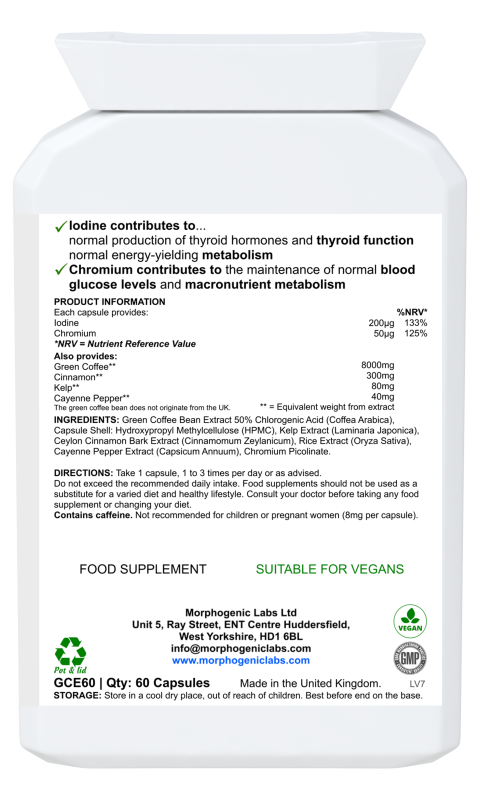 Other Ingredients: Green Coffee Bean Extract (Coffea Arabica, 50% Chlorogenic Acid), Capsule Shell: Hydroxypropyl Methylcellulose (HPMC), Kelp Extract (Laminaria Japonica), Ceylon Cinnamon Bark Extract (Cinnamomum Zeylanicum), Rice Extract (Oryza Sativa), Cayenne Pepper Extract (Capsicum Annuum), Chromium Picolinate.