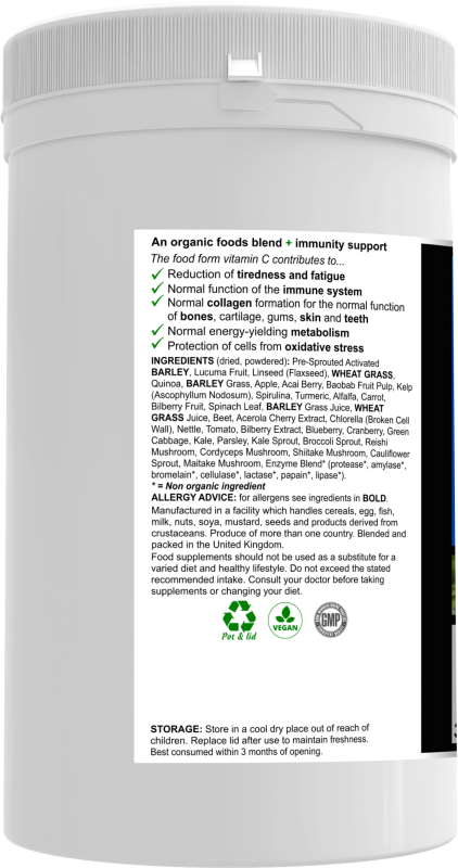 Pre-Sprouted Activated BARLEY, Lucuma Fruit, Linseed (Flaxseed), WHEAT GRASS, Quinoa, BARLEY Grass, Apple, Acai Berry, Baobab Fruit Pulp, Kelp (Ascophyllum Nodosum), Spirulina, Turmeric, Alfalfa, Carrot, Bilberry Fruit, Spinach Leaf, BARLEY Grass Juice, WHEAT GRASS Juice, Beet, Acerola Cherry Extract, Chlorella (Broken Cell Wall), Nettle, Tomato, Bilberry Extract, Blueberry, Cranberry, Green Cabbage, Kale, Parsley, Kale Sprout, Broccoli Sprout, Reishi Mushroom, Cordyceps Mushroom, Shiitake Mushroom, Cauliflower Sprout, Maitake Mushroom, Enzyme Blend* (protease*, amylase*, bromelain*, cellulase*, lactase*, papain*, lipase*).