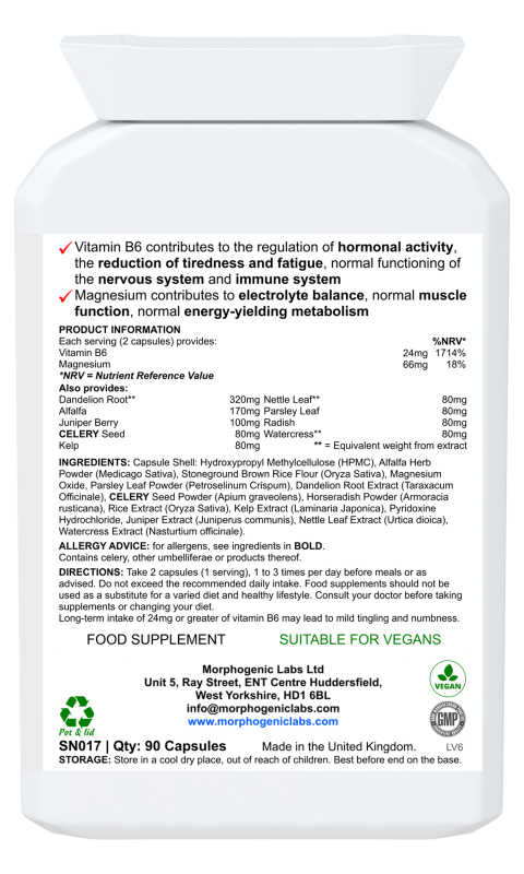 Its unique formula combines essential nutrients like Magnesium and B6 with traditional herbs such as Nettle Leaf, Parsley, and Juniper Berry for effective results.